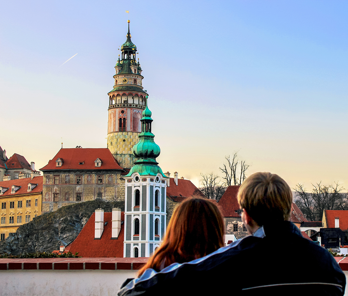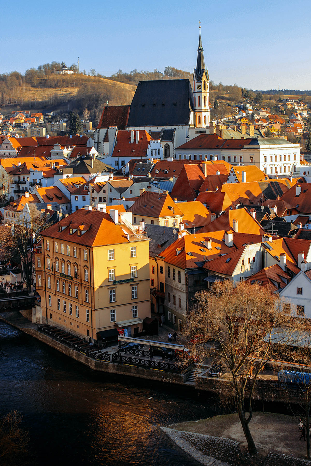 Tras algunas horas de viaje desde Praga, aparece la ciudad de Český Krumlov acurrucada en un recodo del río Moldava. La silueta de su torre sobresale por encima de las casitas de teja anaranjada amontonadas una sobre otra, queriendo salir todas retratadas en esta panorámica de postal.