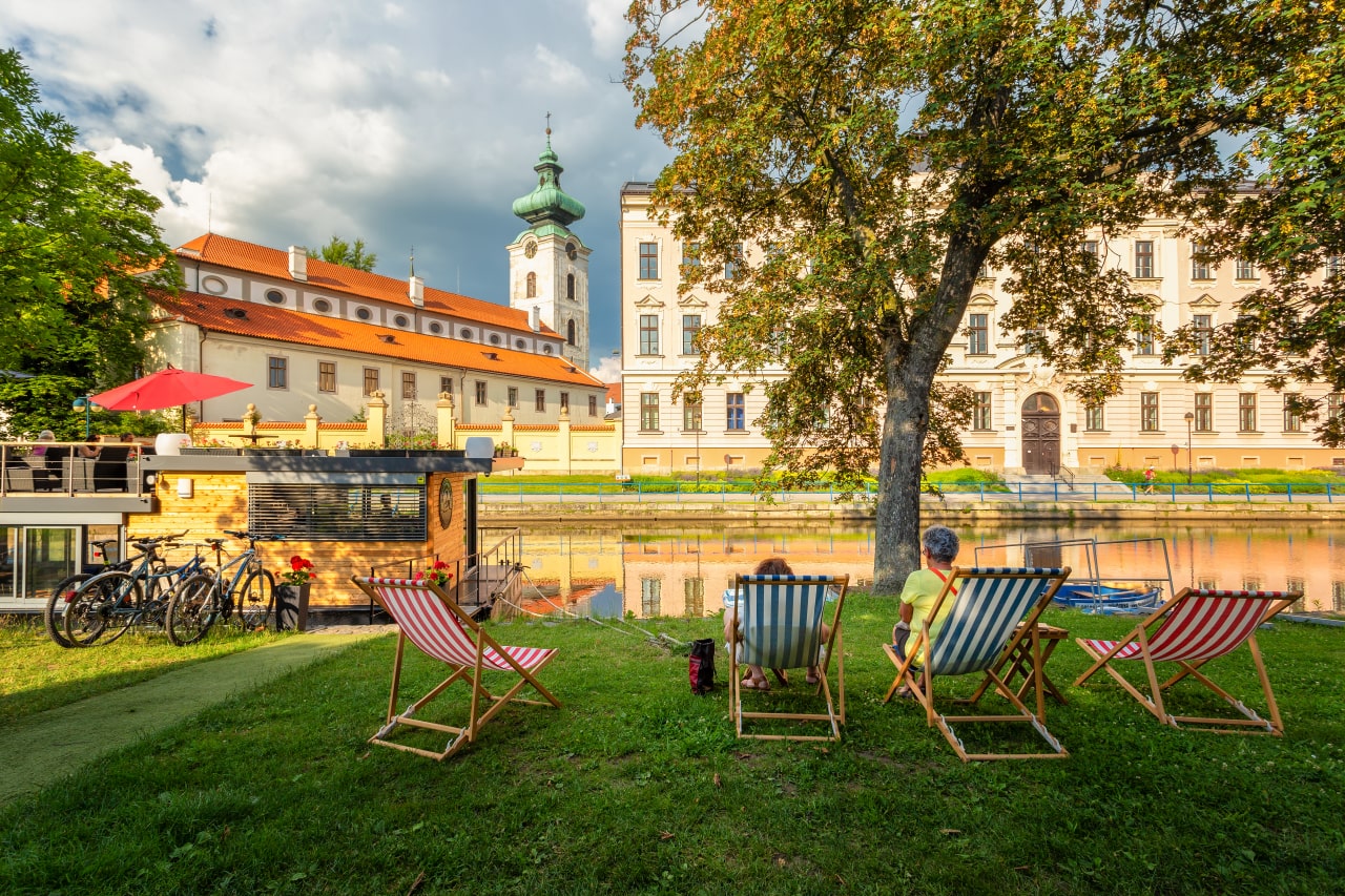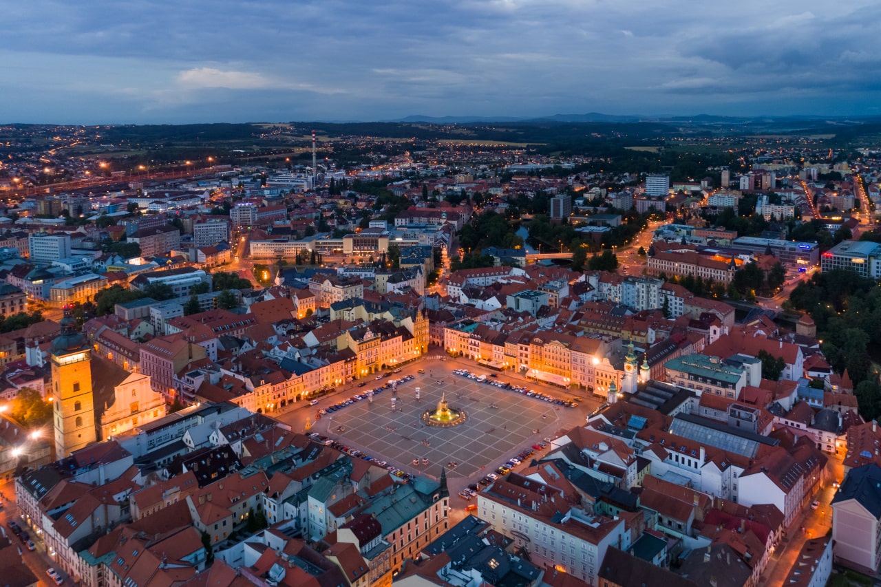 Con 133 metros por lado, lo que viene siendo una hectárea, nace una de las plazas más bellas de Chequia. Porticada, arco a arco, deja paso a una serie de edificios completamente diferentes que se sumergen con colorido en los estilos barroco y renacentista. Quizás el más destacado es el Ayuntamiento, con unos curiosos canalones de dragones y las estatuas representando a la Justicia, Valentía, Sensatez y Cautela en la cima de una de las construcciones dotadas con mayor elegancia de la ciudad.