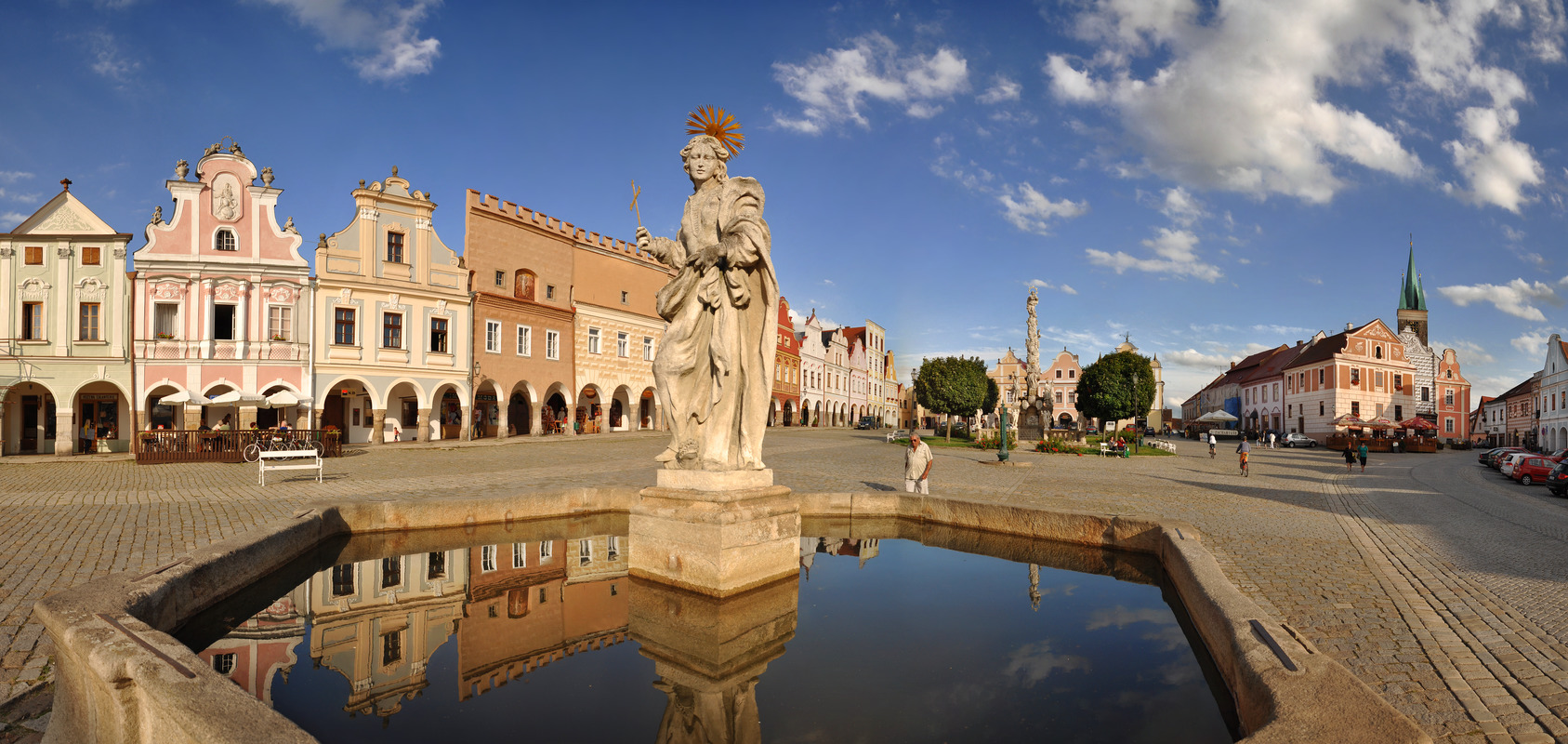 Al llegar a la cima, Telč se devela en toda su extensión: desde las alturas se aprecian los canales que le han dado el apodo de “la Venecia checa”; a lo lejos, se asoman los pórticos coloreados y las torres de las iglesias con sus cúpulas abulbadas. De súbito, surge un jardín geométrico abrazado por gruesas murallas, a un costado de la torre. Es el viejo palacio de los Hradec, antiguos señores de la ciudad, adornado con frescos de escudos heráldicos en las balaustras.